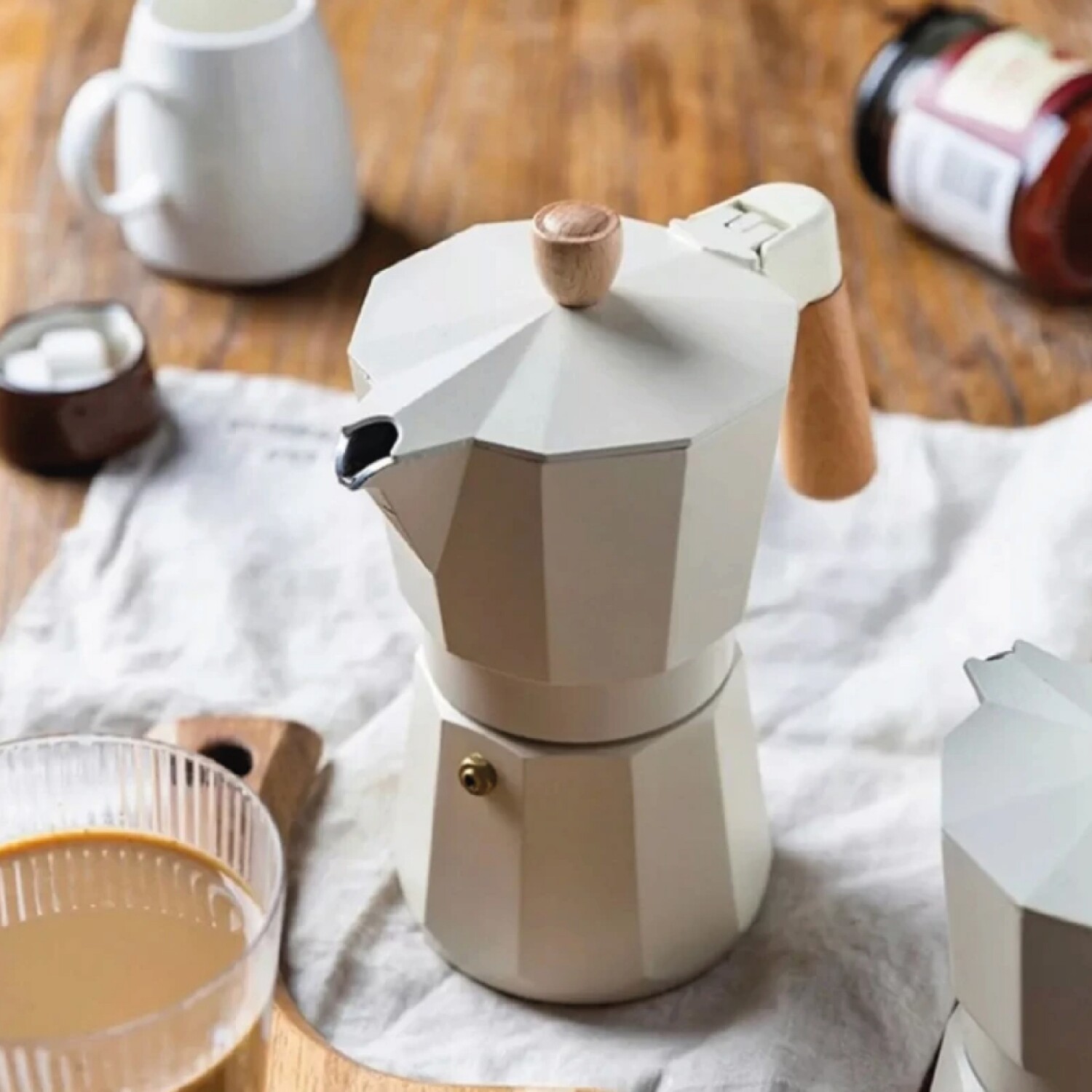 CAFETERA ITALIANA ALUMINIO 300ML 6 TAZAS CREMA MANGO MADERA VARENNA